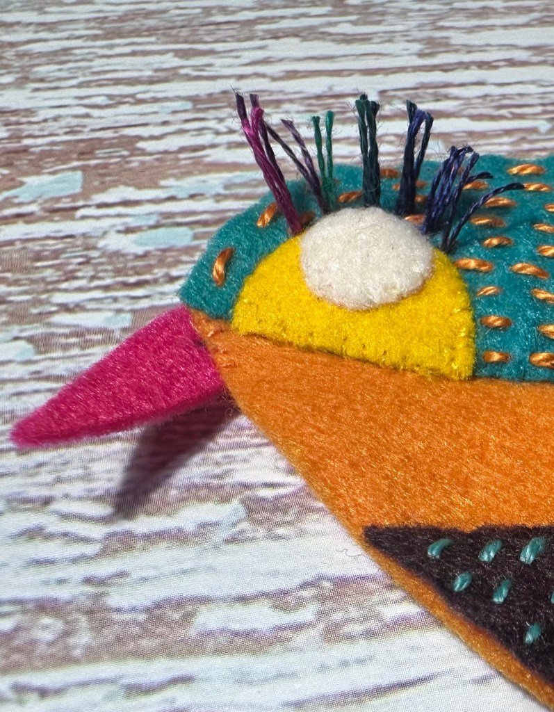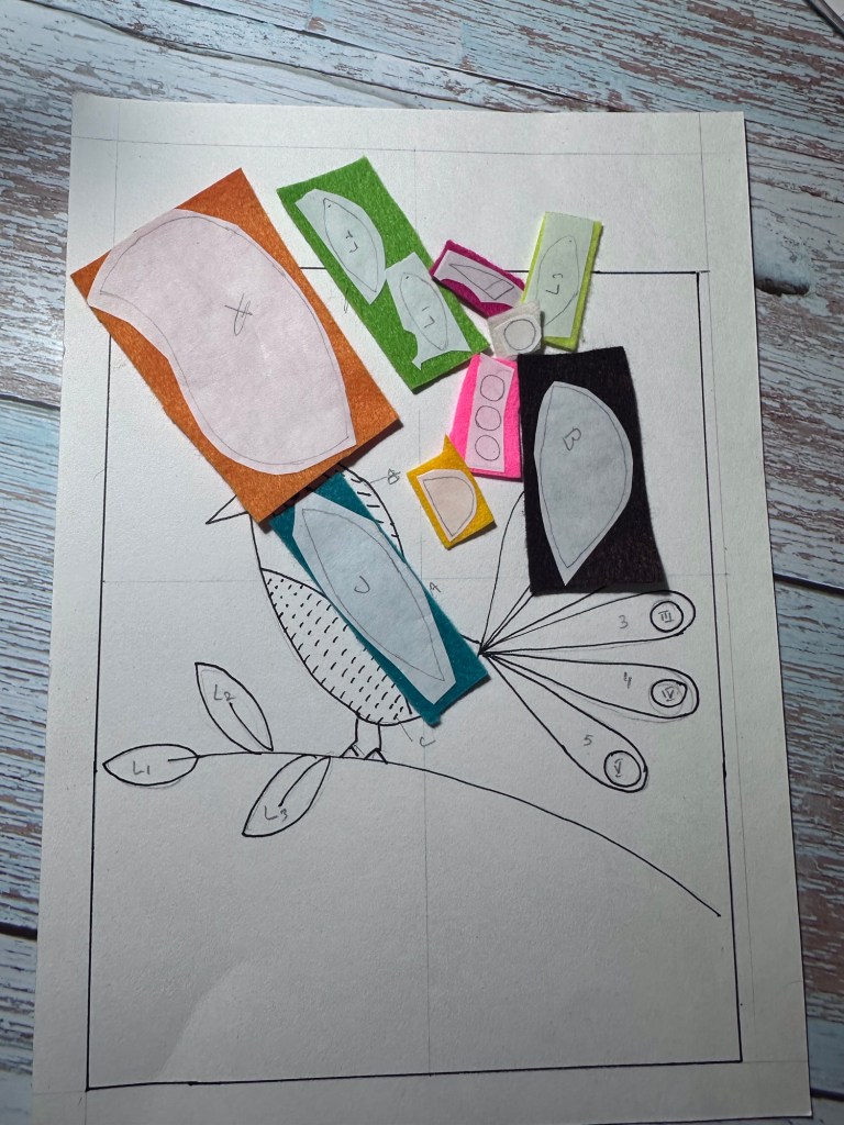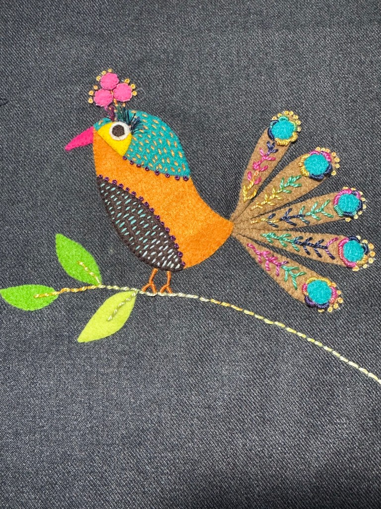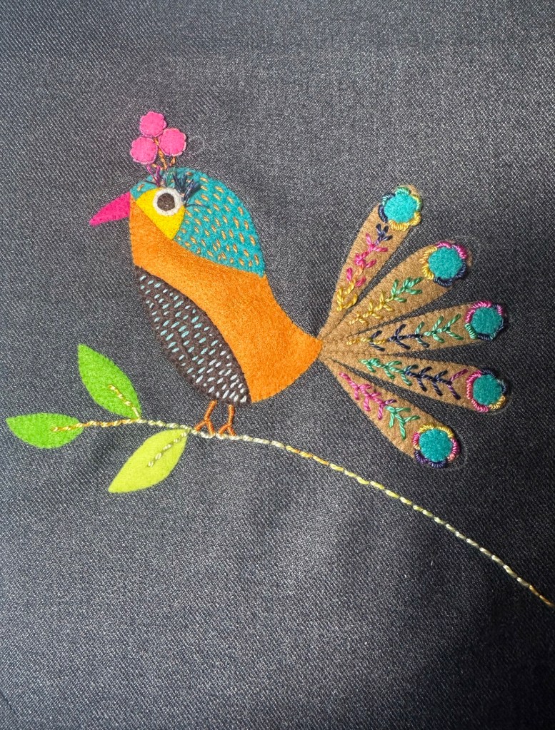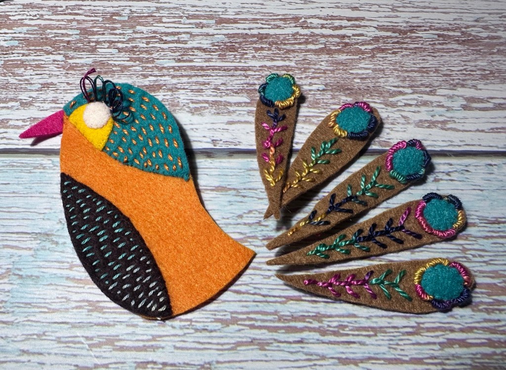 Whip stitch the felt pieces together, then stitch to the background decorative touches with French knots wherever you feel like. It’s your peacock now.