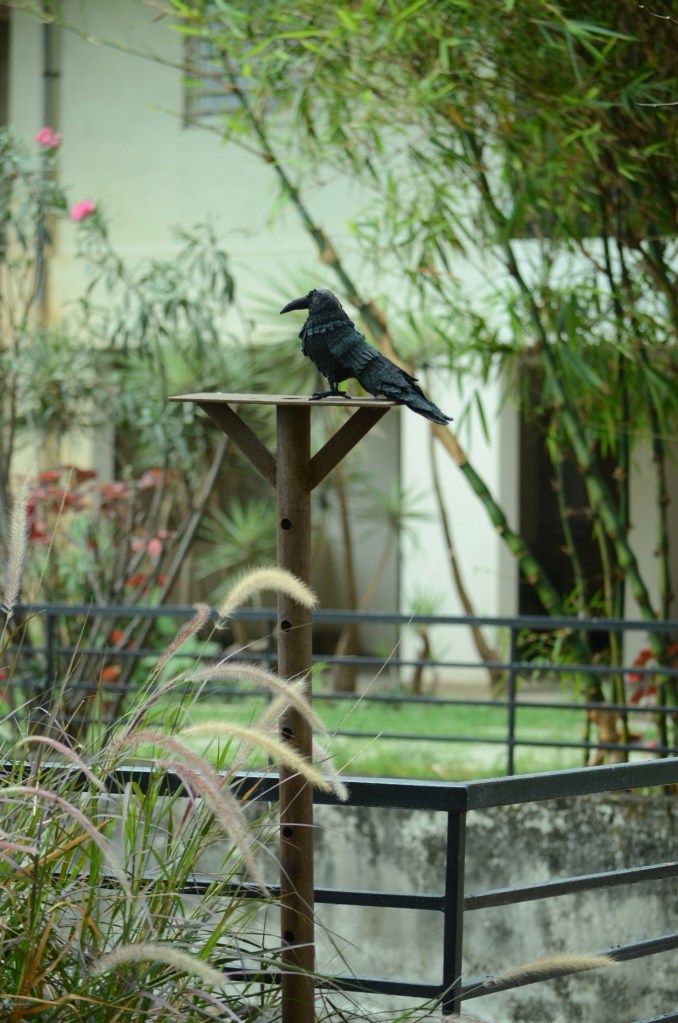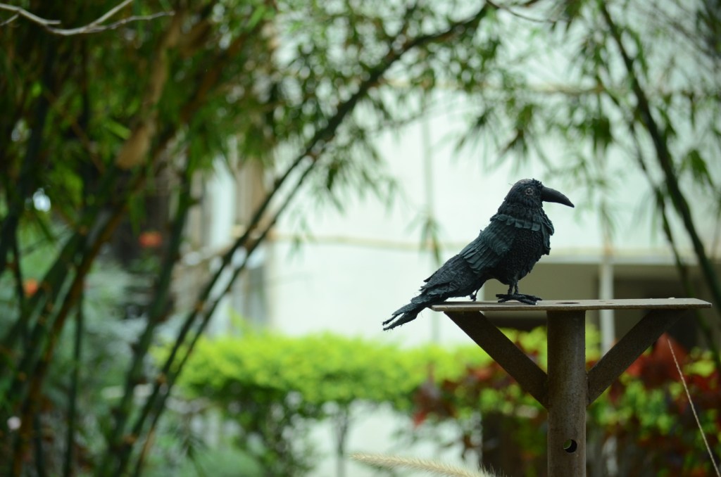 Surface detailing is added through fabric selection and subtle stitching, allowing the depth of black tones to define the personality of the piece. The simplicity of color is balanced with attention to texture and finish, giving the crow a bold and expressive identity.