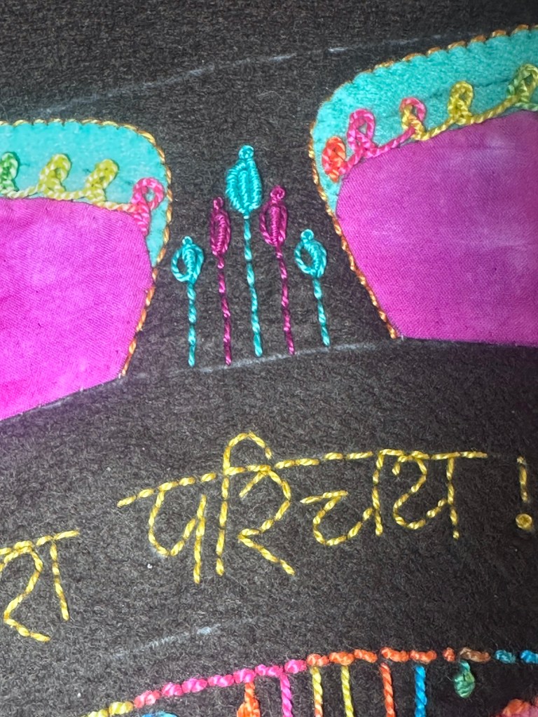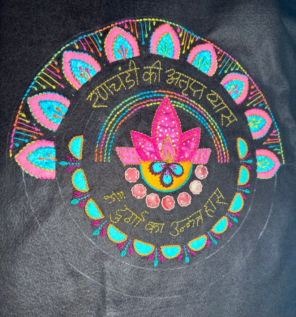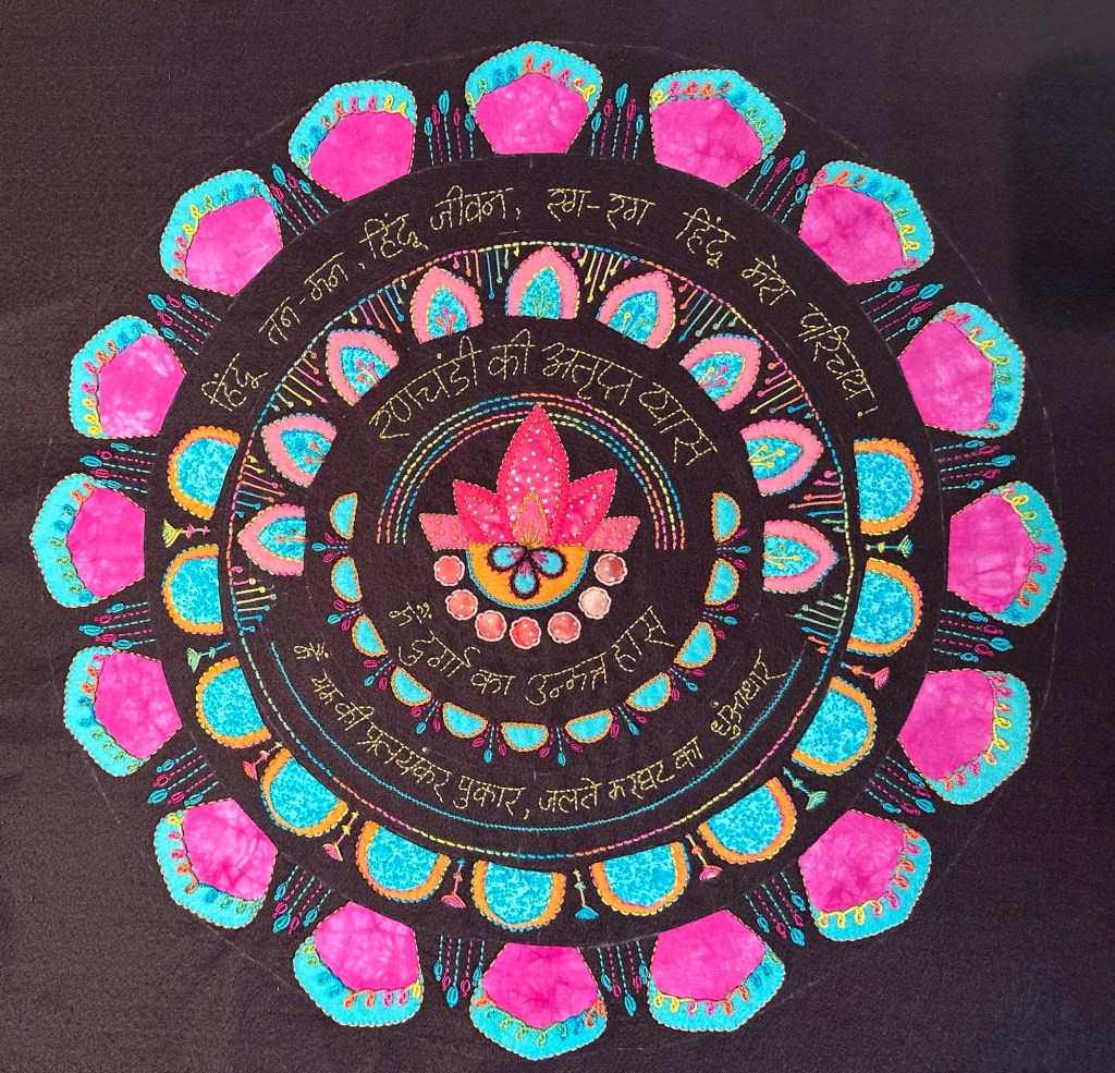 This mandala was constructed through layered appliqué and precise stitching. The work integrates lines from a poem by Atal Bihari Vajpayee, forming a circular structure that combines text and geometry. The repetitive stitching required for the mandala creates a steady rhythm of construction. Over time the work developed a strong visual and emotional presence, where symmetry, text, and intricate hand embroidery reinforce one another.