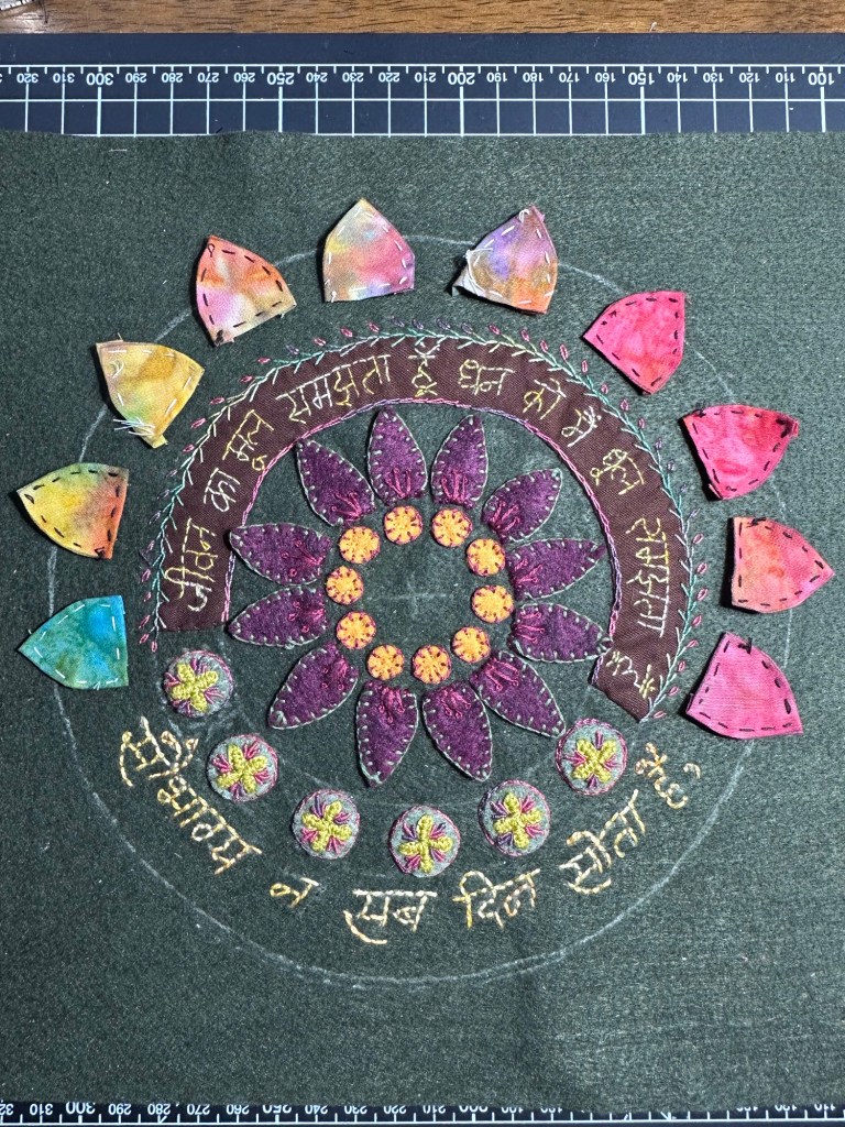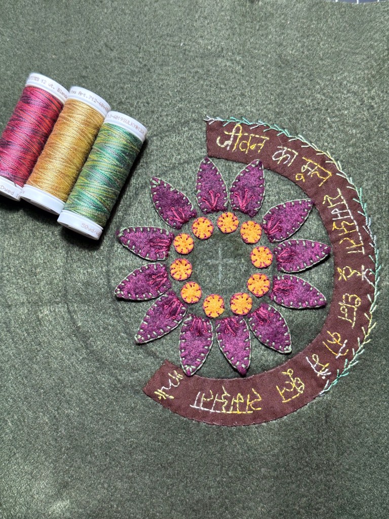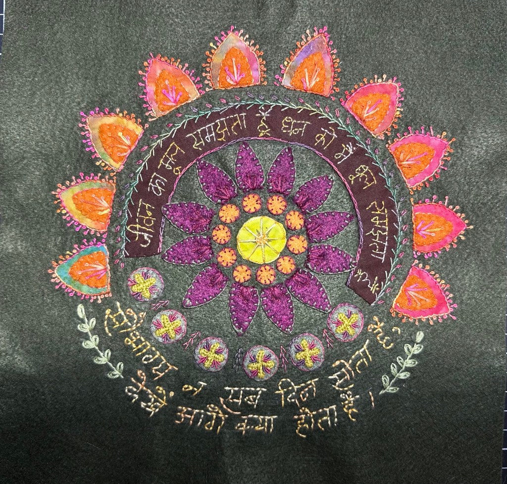 Felt appliqué forms the main geometric elements, while embroidery refines the shapes and integrates the text into the mandala. The circular structure allows words, color, and pattern to move together rhythmically across the surface.