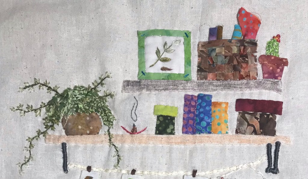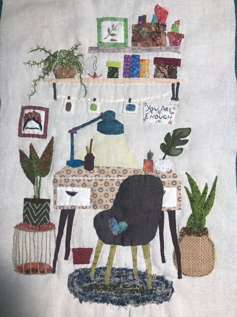 A quiet corner of my old studio, stitched back to life; this hand appliqué, hand quilted wall quilt holds the beauty of everyday details I once lived among. From the patterned work desk and soft glow of the lamp to the little jars, threads, and plants that kept me company, every element is a memory carefully placed. The shelves carry not just objects but fragments of time, and the tiny note, “You are enough” feels like a whisper from that space.