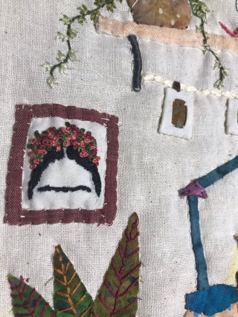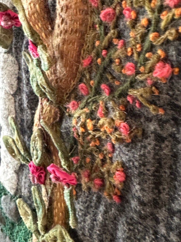 Built on a wool background, the piece uses wool appliqué and wool embroidery to add depth, structure, and a tactile quality. The layered construction gives the work a subtle sculptural presence while maintaining the softness of textile.