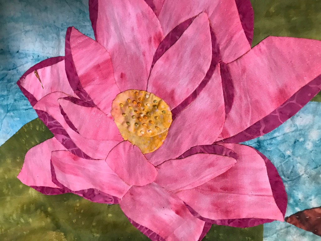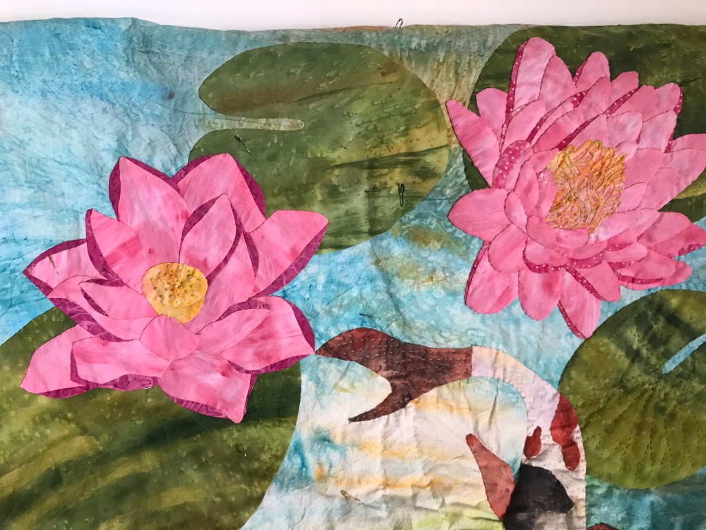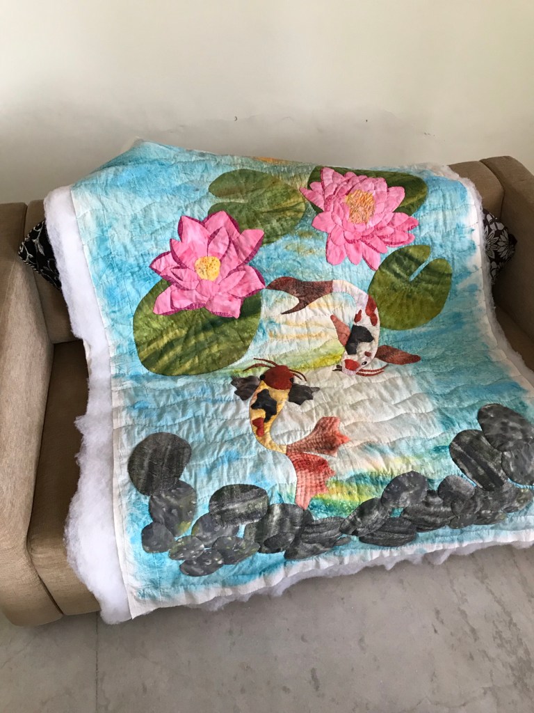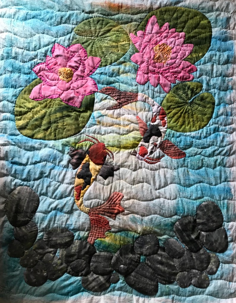 In this quilt, I hand-dyed the fabrics to create layered shades that give the water a sense of depth and movement. Lotus flowers and broad leaves float across the surface while koi glide beneath, forming the central composition.