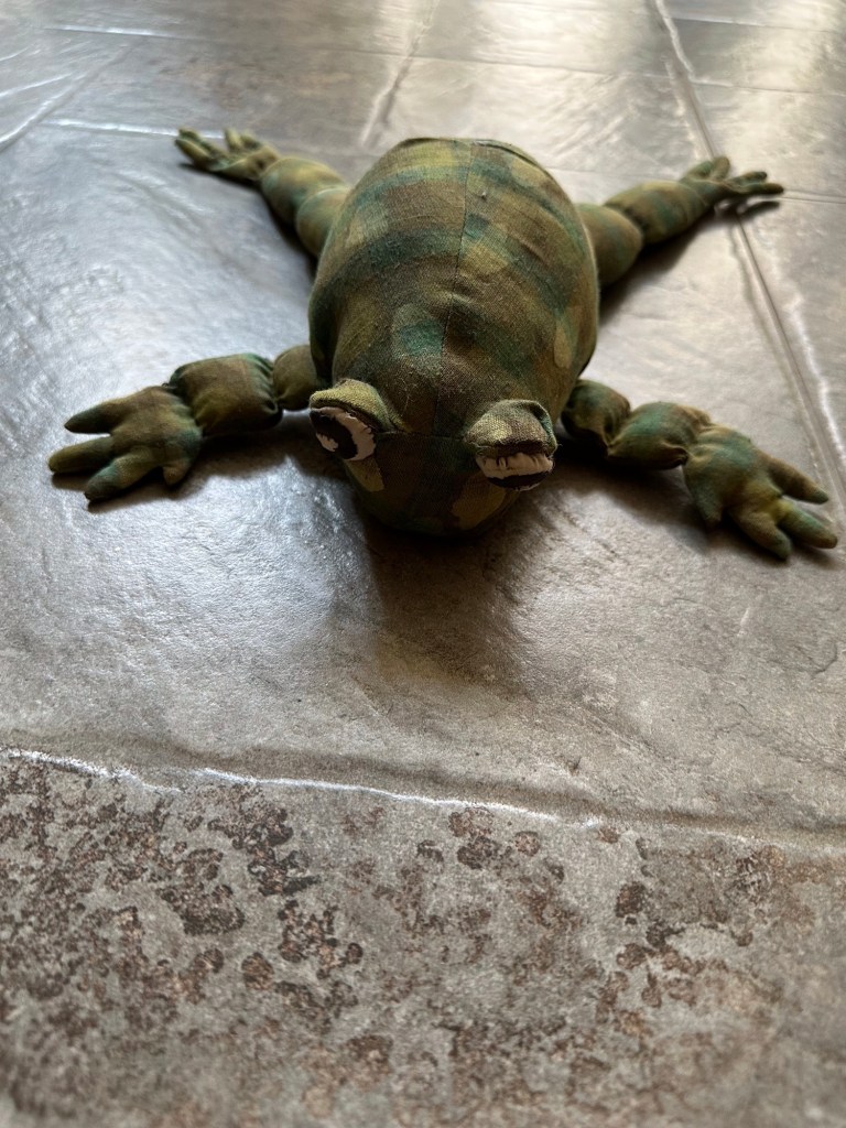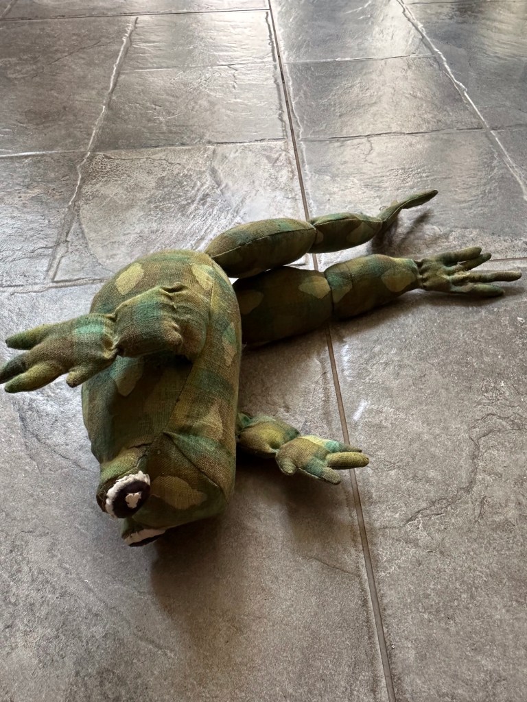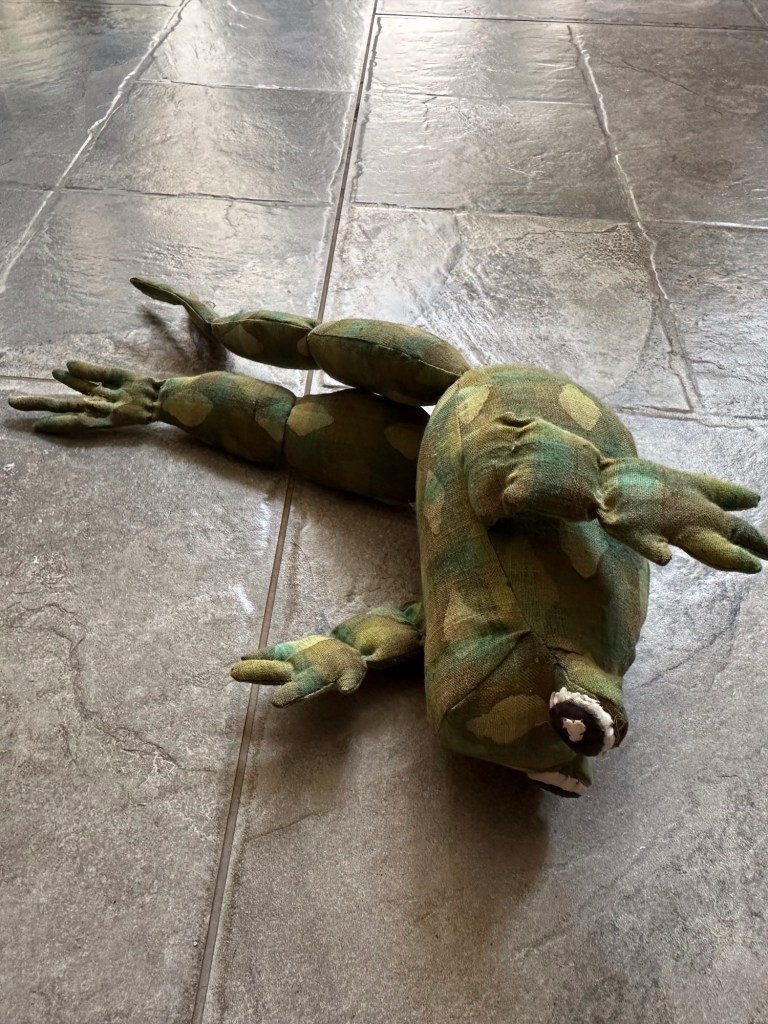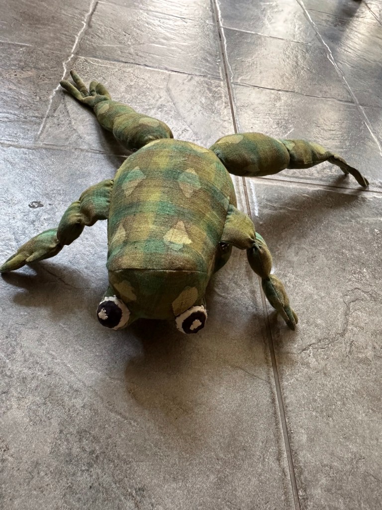 A soft-bodied frog, shaped in cotton and filled with polyfill, resting low as if it belongs to the ground it sits on. Its form is simple, almost unhurried, with limbs spread wide like it has claimed its space without asking. The fabric carries a muted, earthy rhythm; greens blending into browns, echoing damp soil, moss, and still water.