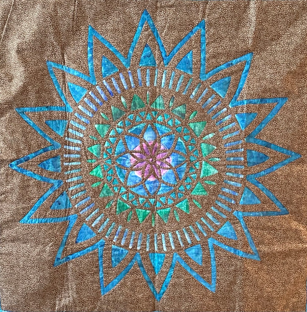 This wall quilt explores mandala geometry through reverse appliqué. The layered structure allows underlying fabrics to emerge through carefully cut shapes, creating a complex radial pattern.