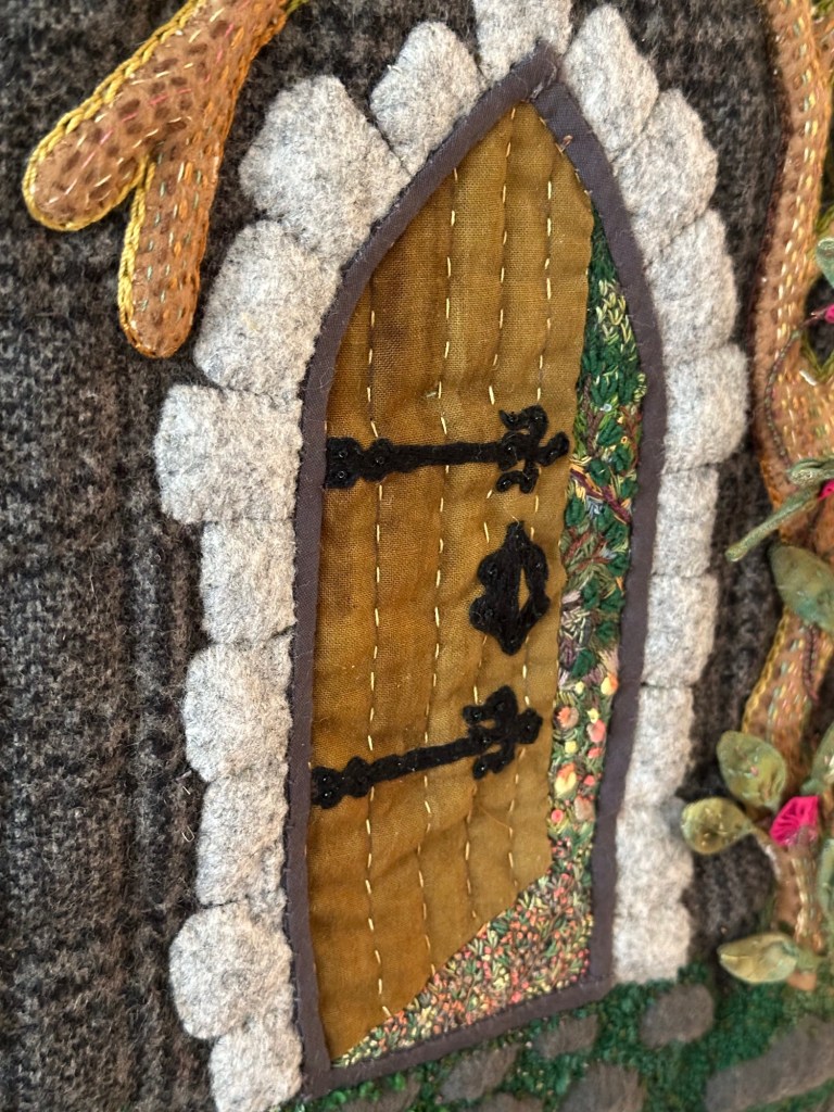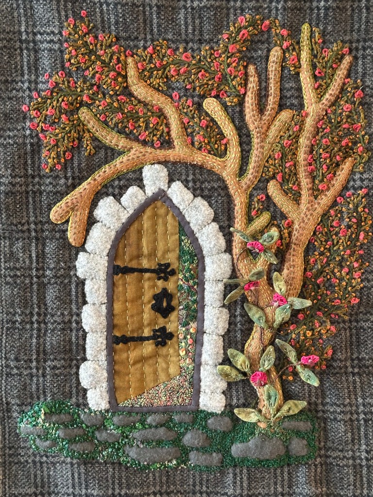 This wall quilt is developed using raised appliqué and three-dimensional embroidery, creating a richly textured surface. The composition features an arched doorway set within a detailed natural setting, where dimensional stitching brings the trees, foliage, and floral elements to life.