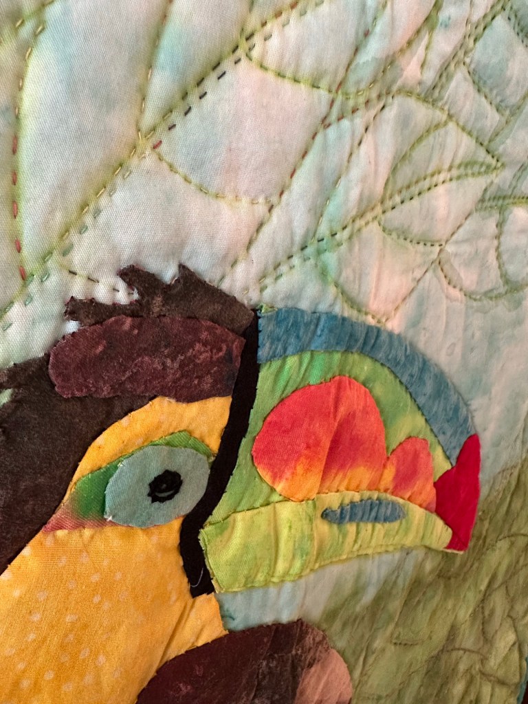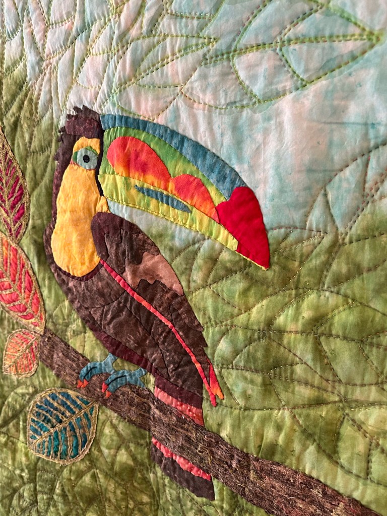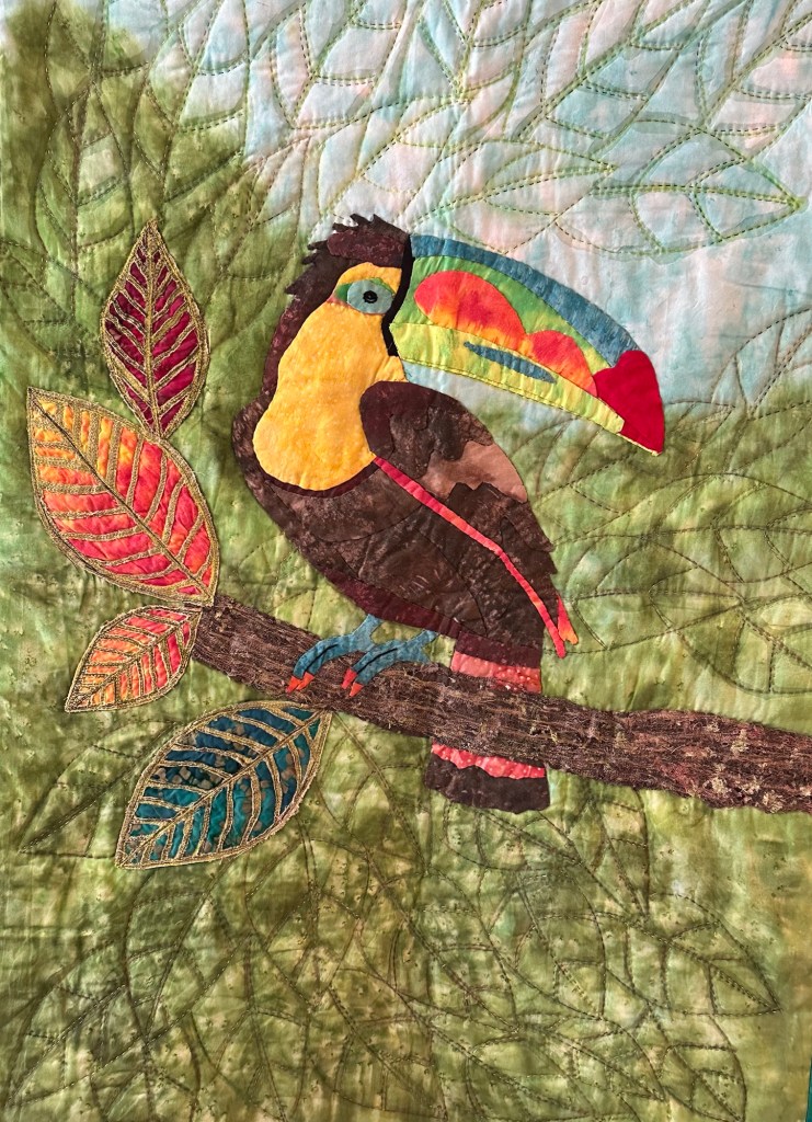 This quilt features a toucan perched among foliage, created with hand-dyed fabrics that add depth and variation to the background. The bird is formed using hand appliqué, while the branch and bold leaves are developed using machine techniques for added texture and structure. The piece is finished with hand quilting.